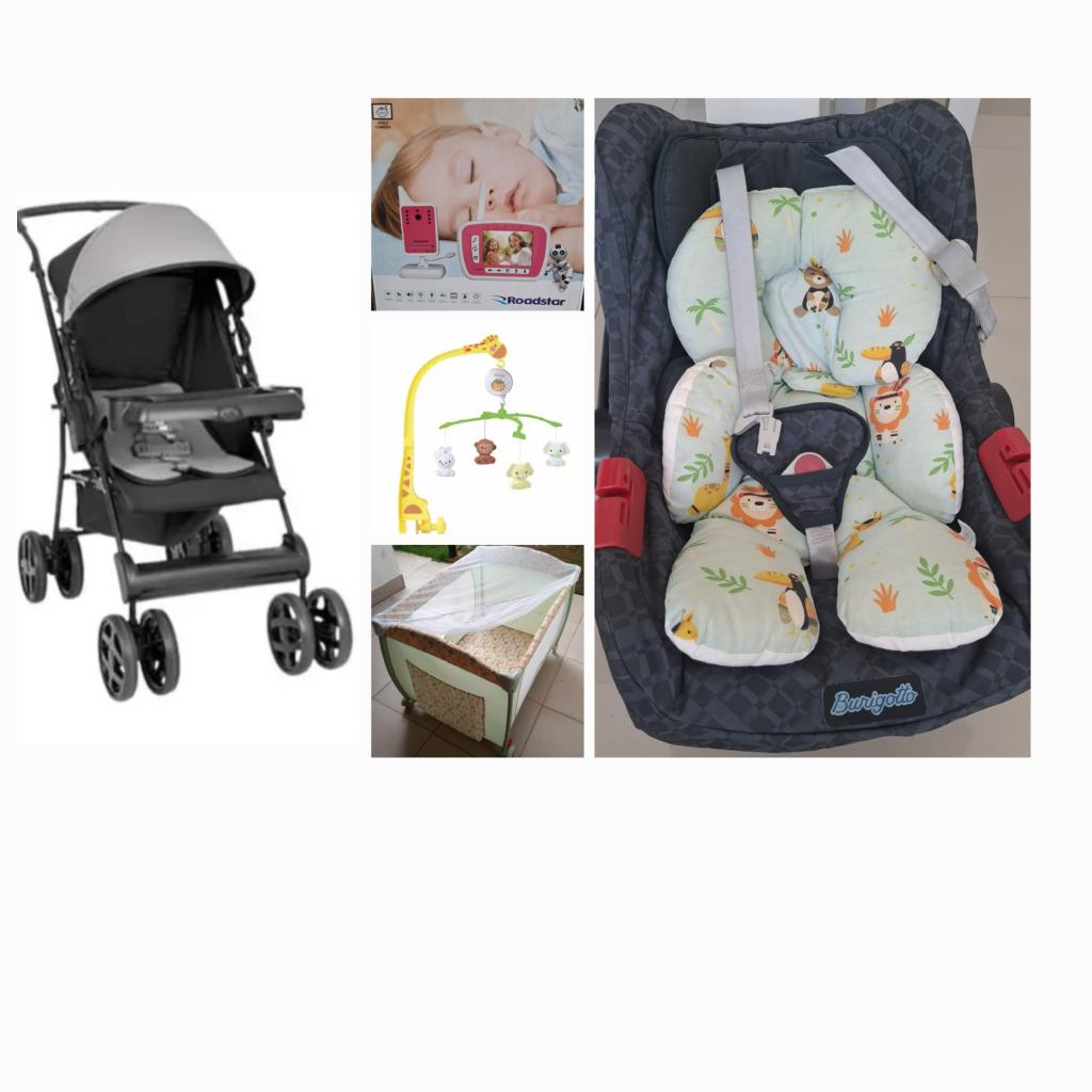 Vende-se Bebê Conforto Burigotto Touring Evolution, azul-escuro, com almofada confort extra R$250,00; Carrinho bebê Solare Tutti Baby preto com cinza/alça reversível com almofada confort extra e cortinado R$480,00; Babá Eletrônica – Vídeo Câmera a cores Roadstar rosa R$200,00; Móbile Musical Pimpolho R$100,00; Berço/ Chiqueirinho desmontável verde, com trocador, colchonete e cortinado R$380,00. Tudo EXTREMAMENTE novo, pouco uso. Tratar 34-98818-0493.